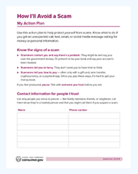That’s where the FTC’s new tool, How I’ll Avoid a Scam: My Action Plan, can help. You can use it to make a list of people you trust — maybe your friend, neighbor, parent, daughter, or grandson — who you can reach out to if you think you might be dealing with a scammer. Talking it through can help you realize that something’s not right.